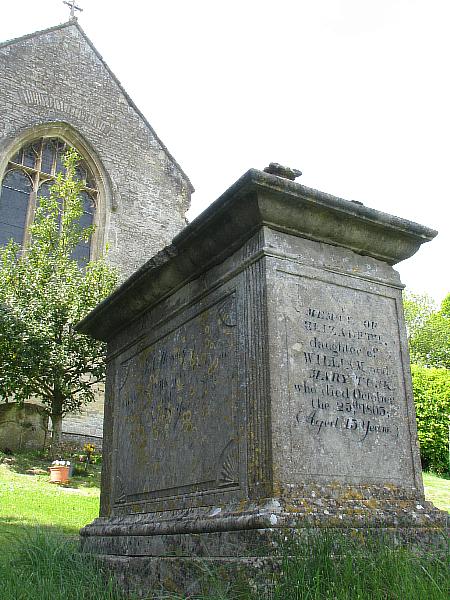 | Chest tomb with inscriptions as follows: "In memory of Charles Turk of Coln St Denis who died November 30th 1834 Aged 78 years." This Charles appears to be the one christened on 13 Nov 1756 at Coln Rogers, Gloucs. "In memory of Elizabeth daughter of William & Mary Turk who died October 25th 1805 Aged 13 years." Therefore born around 1792. |