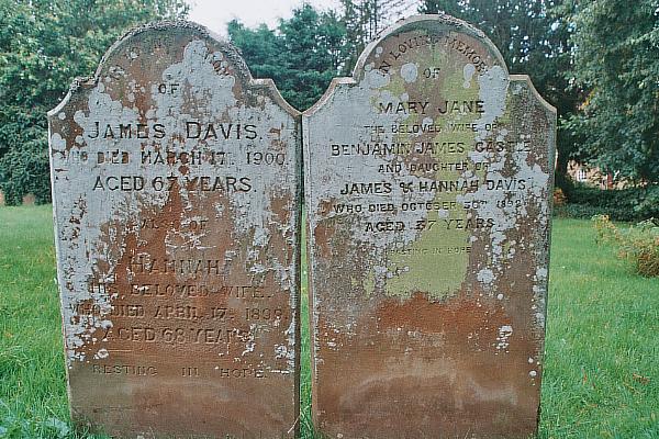 Both James CASTLE (abt 1818-1884), which notes that he was parish clerk for over 50 years, and his son's wife Mrs Mary Jane CASTLE (nee DAVIS, abt 1855-1892) have headstones near the church path.
