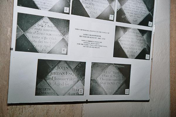 Fisher cites Bishop Rawlinson's word as his only evidence that Mr JORDAN of Burford, Oxon purchased Kencot Manor in 1708 from the YATEs of Buckland (Fisher, pg 74). There is a memorial to John JORDAN in the church. It is now obscured but someone has thoughtfully put a photogph on the wall. The inscription reads 'John JORDAN Esq Died January 21st 1770'