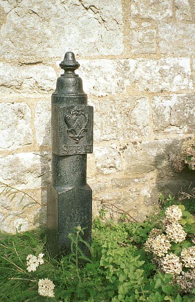 In the churchyard stands an old cast iron post with a coat of arms and